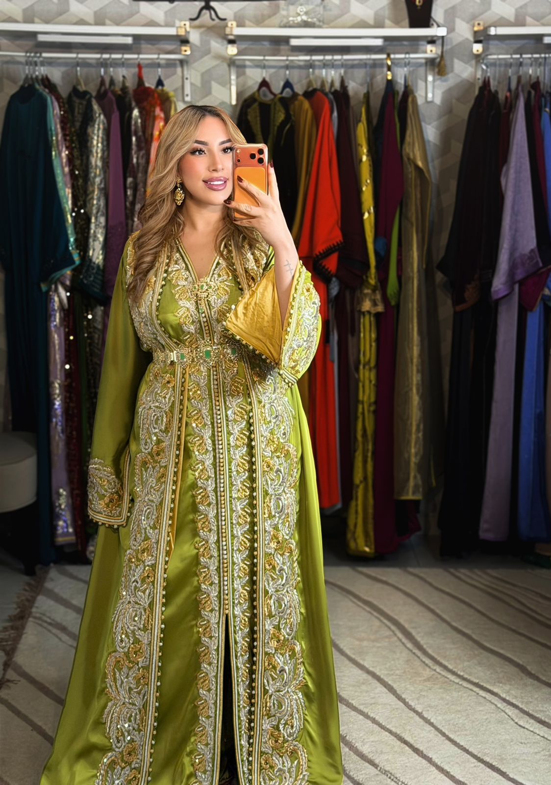 مكونة من قطعتين من الحرير، مبطنة أيضًا من الداخل بالحرير، ومزينة بأفضل وأجود أنواع الخرز المنبت بدقة لتمنحك فخامة وأناقة استثنائية