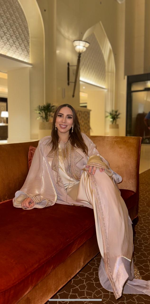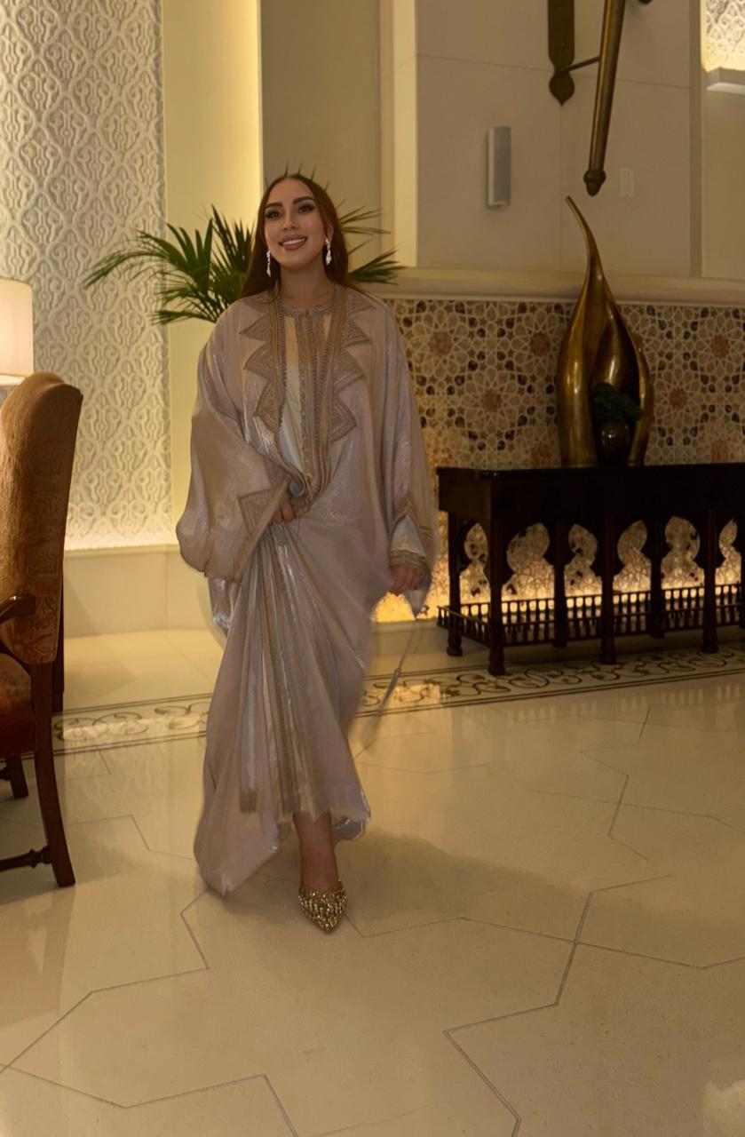 قفطان قطعتين فاخر من قماش الأورغانزا والحرير، بتطريز يدوي متقن.