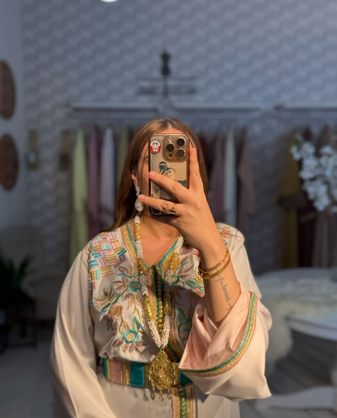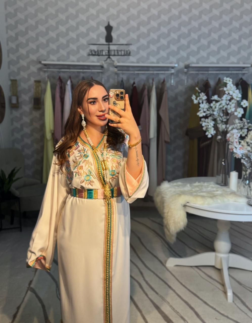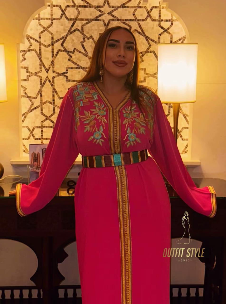 صمّمنا لكِ يا سيدتي هذا القفطان الأنيق بتطريز رباطي متقن، بألوان رائعة تنبض بالحياة.